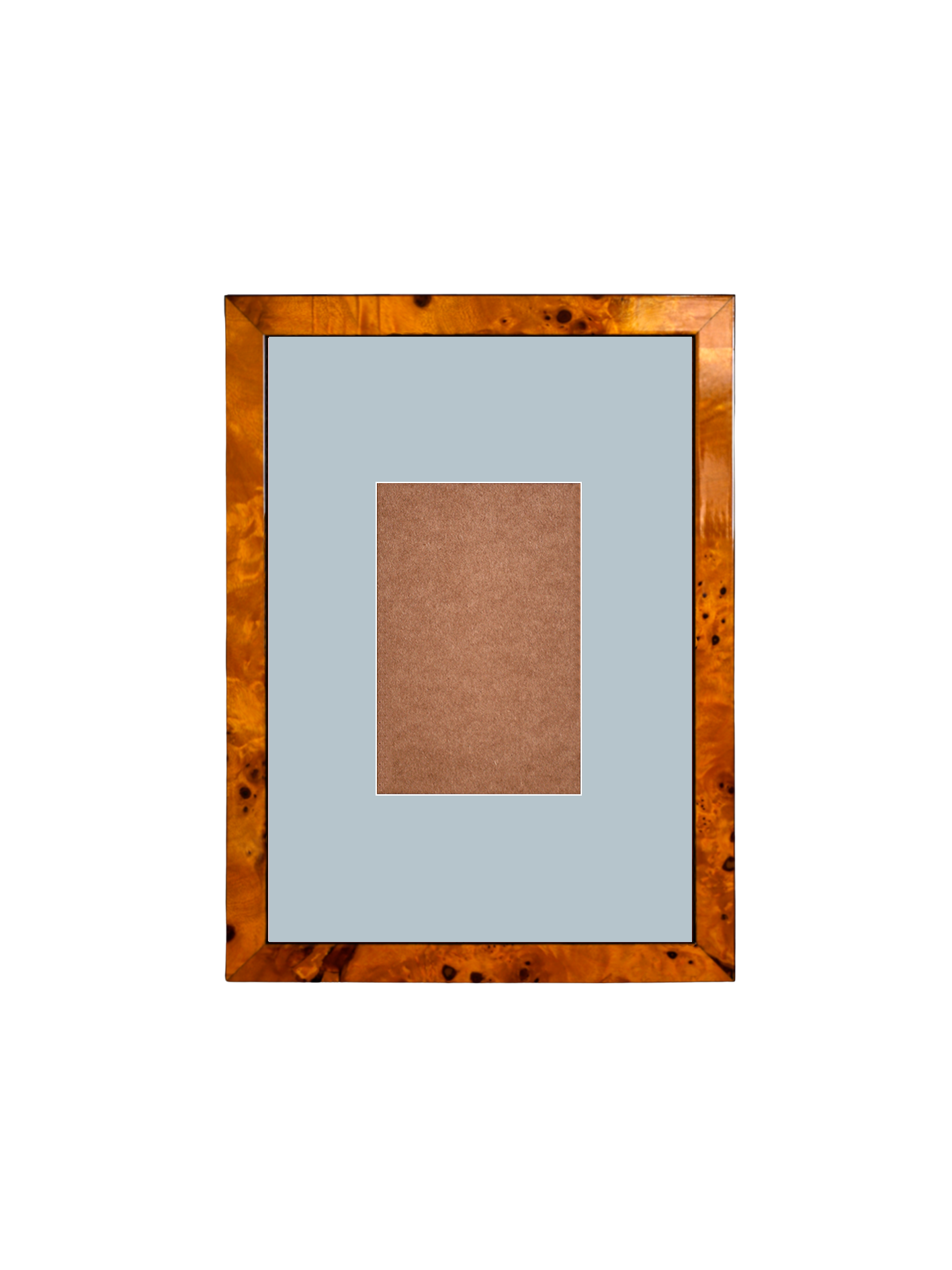 For a touch of old school glamour, the Edie's glossy elm burl veneer frame meets our baby blue Bluebell mount. Edie will become the centrepiece on your wall with the wood’s natural swirling pattern meaning no two frames can be the same.