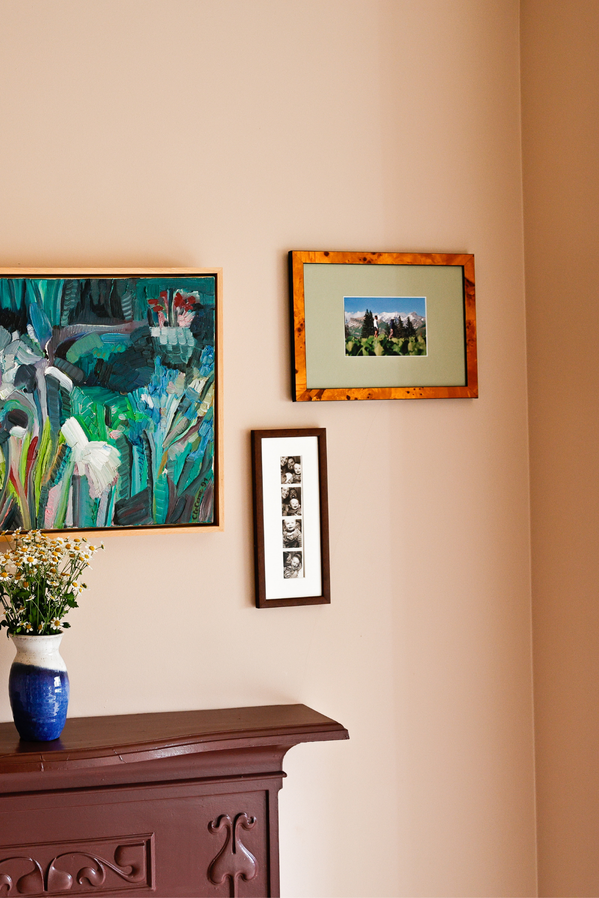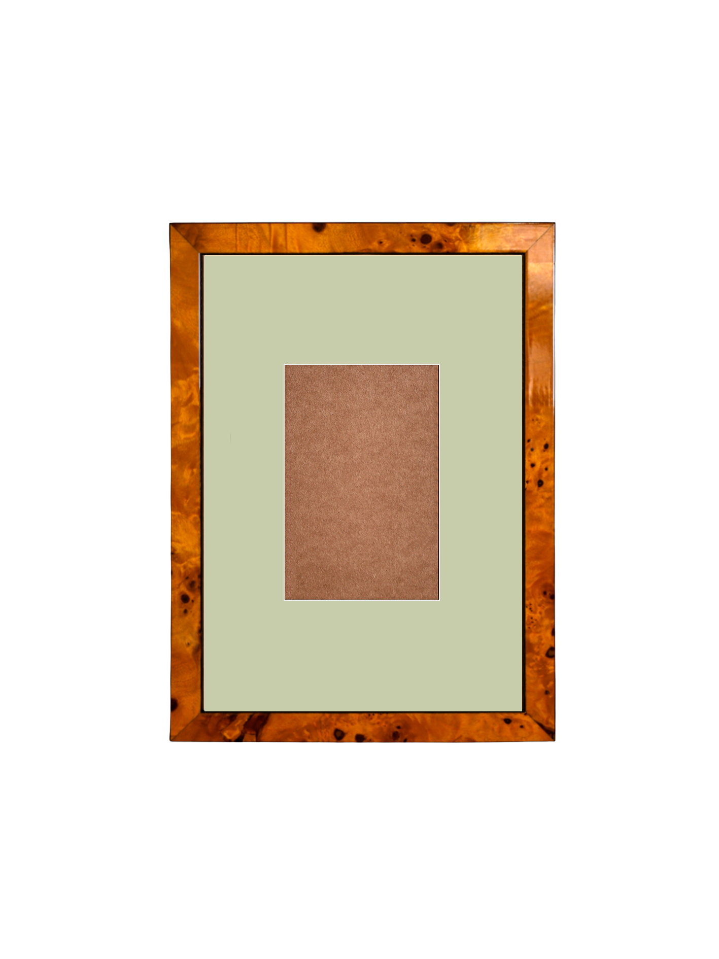 For a touch of old school glamour, the Edie's glossy elm burl veneer frame meets our sage green Moss mount. Edie will become the centrepiece on your wall with the wood’s natural swirling pattern meaning no two frames can be the same.